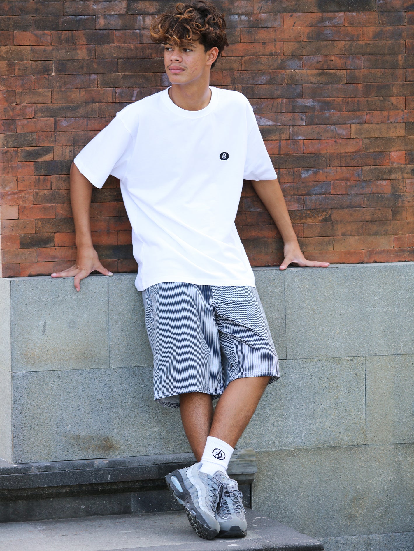 Bordir Volcom di kantong kanan belakang dan bordir logo Stone di sisi dalam kaki kiri